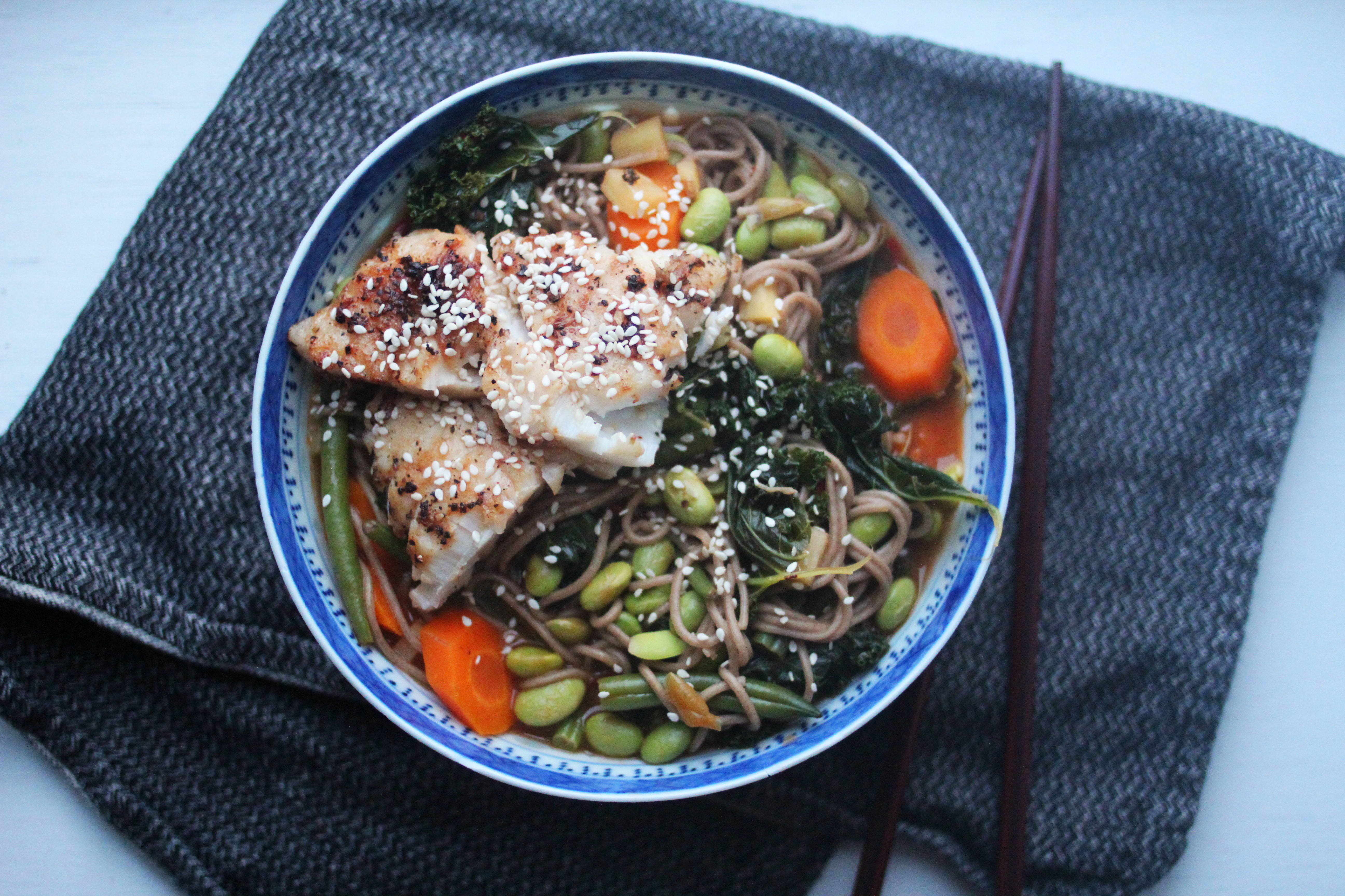 1. Ramen er en vanlig rett i Japan, og er en fellesbetegnelse for forskjellige nudelsupper. Denne oppskriften på ramen bruker torsk som hovedingrediens og forberedes på 1-2-3. Server rett i skåler og strø over sesamfrø for en rett som ser god ut, og smaker enda bedre.